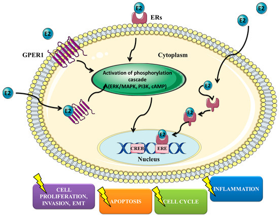 It is known that estrogens modulate both physiological and pathophysiological processes [4]. Nevertheless, they also have a vital role in the functioning of the cardiovascular and immune systems [5,6]. The ovaries are the central reproductive organs of women that produce hormones such as testosterone, progesterone and estrogen [7]. Hormones produced by the ovaries play a vital role not only in the ovaries but also in the endometrium, where they stimulate changes in the endometrium during periodic changes [8]. Therefore, proper functioning of the ovaries is necessary for, among others, maintaining pregnancy. Among estrogens, we can distinguish estrone (E1), 17β-estradiol (E2) and estriol (E3), of which E2 is the most dominant estrogen [4]. It was observed that estrogens may stimulate the growth of ovarian cancer cells in vitro [9]. For example, Matsumura et al. showed that E2 stimulates the proliferation of Caov-3 and OVCAR3 cells via Akt/ERK cascades [10]. Interestingly, it was noticed that hormone replacement therapy (HRT) in postmenopausal women is associated with increased incidence and mortality of OC [11]. Therefore, the question was whether physicians should treat women after resection of ovaries with HRT. Fortunately, Eeles et al. stated that women after surgical treatment of OC can safely take HRT, to help them overcome inconvenience associated with the resection of the ovaries and lack of production of hormones [12]. It was also presented that HRT administration is related to the reduced risk of colorectal cancer (CRC) incidence [13]. In turn, it was observed that HRT increases the recurrence of breast cancer (BC) with positive hormone receptors [14]. Side effects of HRT were also linked with cardiovascular diseases [15]. Nevertheless, the statement regarding HRT and coronary heart disease has changed in recent years [16]. Although the role of HRT and its negative impact on women’s health have been discussed for several decades, no clear conclusions have yet been drawn. Recent results are hopeful, suggesting that HRT does not have as many negatives as initially thought, and significantly increases the quality of life. Cellular signaling of estrogens is mediated via ERs. ERs are a family of transcription factors that control the biological function of estrogens via regulating gene transcription through estrogen response elements (EREs). Estrogens may modulate the biology of cancer cells by affecting processes like cell proliferation, invasion, apoptosis, cell cycle and inflammation (Figure 1).