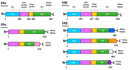 Figure 2. Structure of estrogen receptor α and estrogen receptor β and their isoforms. ERα—estrogen receptor α, ERβ—estrogen receptor β, AF1—activation function 1, AF2—activation function 1.