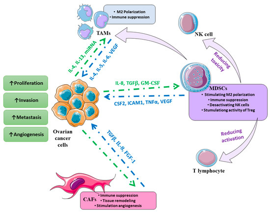 Figure 3. Schema presenting the interaction of the compartments of TME that stimulate ovarian cancer. TAMs—Tumor-Associated Macrophages, MDSCs—Myeloid-Derived Suppressor Cells, CAFs—Cancer-Associated Fibroblasts. The graphical illustration was prepared by using images from Servier Medical Art by Servier. Minor modifications were made (e.g., the color of the stock images) (https://smart.servier.com/smart_image/, accessed on 21 August 2023).