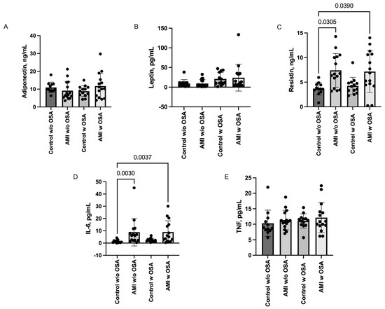 Vega-Jasso, A.L.; Amezcua-Guerra, L.M.; González-Pacheco, H.; Sandoval-Zárate, J.; González-Díaz, C.A.; Escobar-Alvarado, J.; Manzano-Luna, J.D.; Brianza-Padilla, M. Adipokines and Inflammatory Markers in Acute Myocardial Infarction Patients with and without Obstructive Sleep Apnea: A Comparative Analysis. Int. J. Mol. Sci. 2023, 24, 14674. https://doi.org/10.3390/ijms241914674