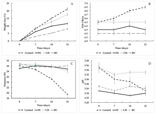 Physical and chemical changes in the treated strawberries (FE, CH, and BC) and control (without treatment) during storage (21 days at 10 °C). (A) Weight loss; (B) total soluble solids; (C) firmness; (D) pH.