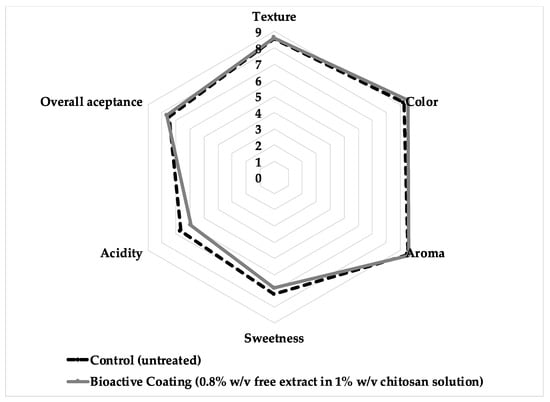 Sensory appreciation of strawberries coated with the bioactive coating (0.8% w/v free Arrayan extract in 1% w/v chitosan solution). Attributes were evaluated on a 9-point hedonic scale, where 1 was “dislike extremely”, and 9 was “like extremely”.