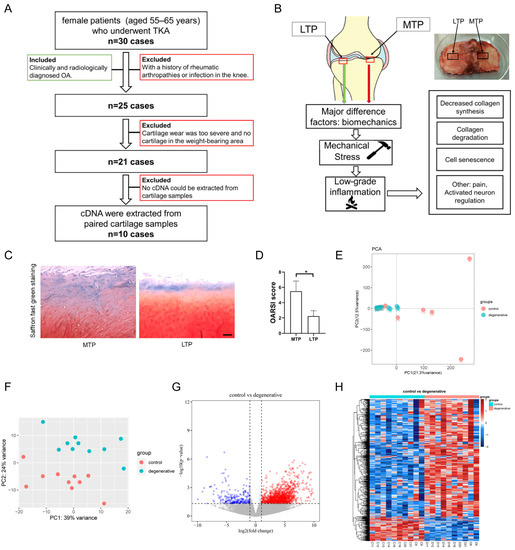 The panoramic comparison is based on the self-contrast model of human knee OA and the identification of DEGs. (A) Flowchart of human OA knee cartilage sample collection. (B) Schematic diagram of a mechano-inflammatory mode of action in the presence of articular cartilage in OA. (C) MTP and LTP cartilage samples were stained with saffron O fast green staining. Scale bar: 100 μm. (D) OARSI score based on saffron O fast green staining evaluated severe degeneration in MTP and LTP cartilage samples. * p < 0.05. (E,F) PCA analyses were performed to visualize the effect before (E) and after (F), removing the batch effect. (G) A volcano plot was generated to depict the differentially expressed genes (DEGs; fold change >2 or <−2, aducsted p-value < 0.05) between MTP and LTP. Upregulated genes are marked in light red; downregulated genes are marked in light green. (H) Heatmap with unsupervised hierarchical clustering showing the expression profile of DEGs in human cartilage. Each row represents one sample, and each column represents one DEG. The scaled expression value (column z-score) is displayed in a blue–red color scheme, with blue and red indicating low and high expression, respectively.