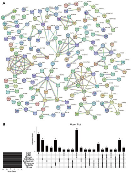 The STRING database explored potential interactions among the DEGs and constructed PPI networks. PPI pairs were extracted based on a medium confidence threshold of >0.4. Cytoscape (version 3.9.1) was used for network visualization, and the cytoHubba plugin was utilized to calculate the ranking of DEGs. The top 25 genes according to eight algorithms (MCC, MNC, Degree, BottleNeck, EcCentricity, Closeness, Radiality, Stress) in cytoHubba were selected. Finally, hub genes closely associated with the development of osteoarthritis were identified using the R package “UpSetR”.