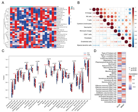 Analysis of the immune infiltrating cells between MTP and LTP cartilages. (A) A heatmap was generated to visualize the relative abundance of immune infiltrating cells between MTP and LTP cartilages. (B) Correlation analysis between OA and immune infiltration. (C) Violin plot showing the fraction of immune cell infiltration by typing in OA samples based on the self-contrast model. Blue indicates LTP, and red indicates MTP. (D) Correlations between hug genes DLG4, Mik67, and infiltrating immune cells.