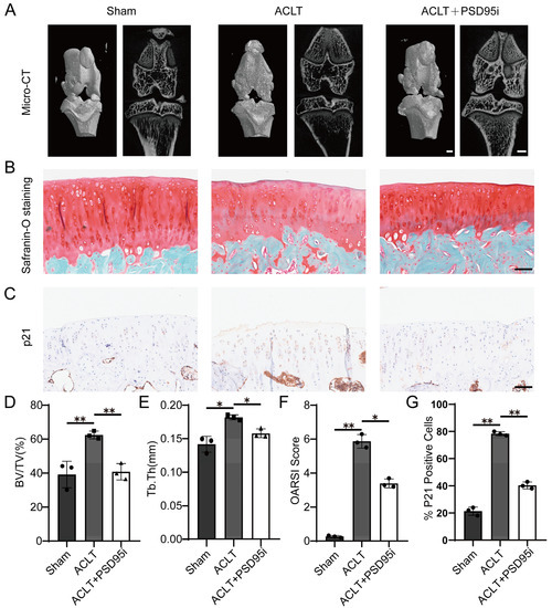 PSD95’s pharmacological inhibition attenuates cartilage degeneration and chondrocyte senescence. (A) Representative micro-CT images from medial femorotibial joints of SD rats 4 weeks after sham surgery or ACLT or ACLT + PSD95i. Scale bar: 1000 μm. (B) Representative images of Safranin O staining of cartilage tissue from medial femorotibial joints of SD rats 4 weeks after sham surgery or ACLT or ACLT + PSD95i. Scale bar: 100 μm. (C) Representative images of immunohistochemistry of p21CIP1 in cartilage tissue from medial femorotibial joints of SD rats 4 weeks after sham surgery or ACLT or ACLT + PSD95i. Scale bar: 100 μm. (D,E) Quantitative analysis of structural parameters of knee joint subchondral bone: bone volume/tissue volume (BV/TV, %) (D), and trabecular thickness (Tb.Th, mm) (E). (F) Calculation of Osteoarthritis Research Society International (OARSI) scores. (G) Quantification of the number of p21+ cells per field of view. The results are presented as the mean ± SD, n = 3 mice per group, * p < 0.05, ** p < 0.01.