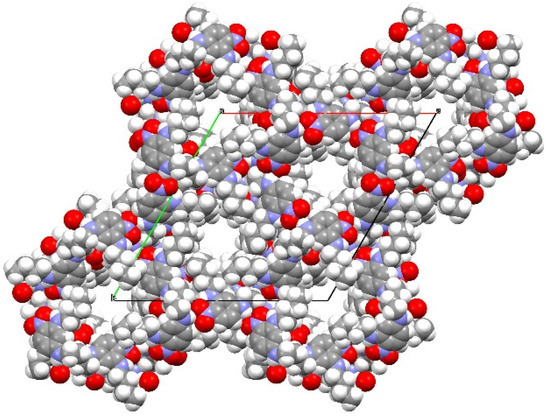 The key synthon of a group of five atoms consisting of an N—H group (adjacent to the benzene ring) with an ortho C—H group (i.e., H—N—Car—Car—H; ar = aromatic) as cooperative hydrogen-bond donor(s) and a nitro group as acceptor in these related phases shows notable flexibility with bifurcated N—H···(O,O), double acceptor (N—H,C—H)···O and cooperative N—H···O + C—H····O′ (we call these B, D and C modes, respectively; see Table 1 footnote and figures above), which are all possible. However, this motif by itself cannot be directly related to the formation of a dense or porous network, as both compound 14 (dense) and 17 (porous) show the same type-C motif. Conversely, both 1 (B mode) and 17 (C mode) show porosity. As noted previously, compounds 1 and 17 are isomers in which the linker and pendant groups have swapped placed on the nitrobenzene ring. The biggest structural difference lies in the conformation of the linking butyl chain, which is very contorted in compound 1 (a–g–a–g–g) (a = anti, g = gauche) and centrosymmetric all-anti in compound 17. A major difference between the extended structures of compounds 1 and 17 arises from the different natures of their pores. In compound 1, the [001] channels may be assumed to be hydrophobic, being lined by six n-butyl chains, but in compound 17, the (31) pores within a single hydrogen-bonded layer must have a more hydrophilic nature, being lined by oxygen atoms (Figure 12). As might be expected, the continuous channels in compound 1 show a far greater bulk porosity (2660 Å3 or 19.8% of the total unit-cell volume) than the separated pores in compound 17 (148 Å3 or 7.6% of the total unit-cell volume). Other weak intermolecular interactions in these structures should also be briefly considered: in compound 1, there are no significant aromatic π–π stacking interactions (shortest centroid–centroid separation = 4.3271 (14) Å), and any C—H···π bonds must be extremely weak, with the shortest H···π distance being 2.88 Å. In compound 14, the shortest π–π centroid separation of 5.0132 (7) Å is far too long to be regarded as a significant interaction, and the shortest C—H···π bond (2.86 Å) is also very weak. Compound 16 shows corresponding values of 4.9853 (8) Å and 2.73 Å for the π–π centroid separation and C—H···π separations, respectively. Finally, compound 17 has a shortest ring-centroid separation of 4.561 (3) Å and a shortest C—H···π contact of 2.69 Å. To this may be added an N—O···π contact with O···π = 3.244 (5), rather less than the van der Waals radius sum of 3.32 Å (assuming a ‘half-thickness’ of an aromatic ring to be 1.6 Å), and N—O···π = 93.5 (3)°, but the significance of such contacts is debated [31].