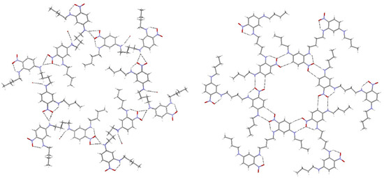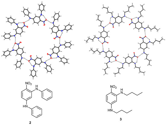 Two examples of hydrogen-bonded hexamers crystallised from 2,4-bis(phenylamino)nitrobenzene 2 and 2,4-bis(butylamino)nitrobenzene 3 (Blue is nitrogen and red is oxygen).