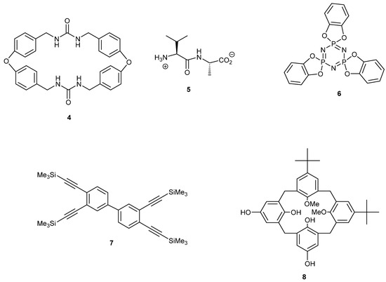Organic compounds that crystallize with channels have been referred to as ‘organic zeolites’ owing to their structural similarity to aluminosilicates [15]. Inorganic zeolites have many applications, such as carbon dioxide capture, hydrogen storage, heterogeneous catalysis and molecular separation [16,17,18,19,20,21]. Soluble precursors required to form organic zeolites may include these applications and extend their range because of solution processing, the choice of components and their functionality (Figure 3) [4]. We and others are also interested in the properties of organic zeolites crystallised from conformationally flexible building block, of which there are many [13]. Cyclic amide host 4 forms cylindrical channels 5–8 Å in diameter stabilised by urea–urea hydrogen bonding and aromatic stacking [22,23]. The material was able to absorb carbon dioxide. Dipeptides, such as compound 5, crystallise with hydrogen-bonded tubular assemblies forming one-dimensional channels with diameters of 3–5.4 Å. These channels were filled with solvent that could be evacuated by heating [24,25]. This dipeptide has substituents that must play a role in its porosity. Rigid trimer 6 forms crystals with empty 1D channels 5 Å in diameter, which can clathrate solvent and organic guest molecules [26,27]. Tetra (trimethylsilyl ethynyl) biphenyl 7 crystallises, forming narrow channels in three dimensions that interconnect large internal voids of diameter 11 Å [28]. The porosity of the de-solvated crystals was shown by hydrogen and nitrogen absorption. Asymmetric calixarene 8 crystallises in a tubular fashion to form two types of void space filled with water molecules. One void space is a 3D network of channels with diameters of 3.9 and 8.5 Å and the other void space consists of spherical cages of 11.2 Å in diameter connected by narrow channels [29,30]. The host retained its structural integrity upon the removal of the water molecules. Host 6 is rigid and hosts 4–5 and 7–8 are all comparatively rigid compared to the new class introduced here.