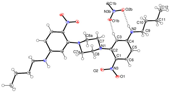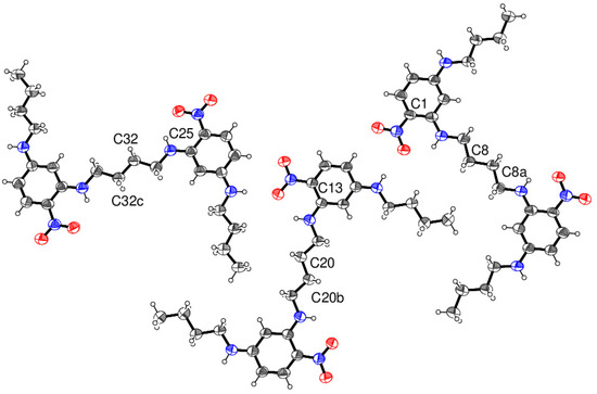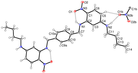 The NMR data for compound 16 are in the Supplementary Materials Figures S3 and S4. The molecular structure of compound 16 consists of a half-molecule in space group P21/n with the complete molecule generated by crystallographic inversion symmetry (the inversion centre is at 1–x, 2–y, 1–z for the asymmetric molecule). The dihedral angle between the central benzene ring and the pendant nitrobenzene ring is 52.97 (4)°, and the nitro group is close to the plane of its attached ring (dihedral angle = 3.98 (15)°), with this near coplanarity being reinforced by an intramolecular N1—H1n···O1 hydrogen bond. The C2—N1—C7—C8 torsion angle is –178.12 (11)°, and the pendant n-butyl chain adopts an extended conformation. In the crystal of compound 16, cooperative N2—H2n···O1 and C5—H5···O1 hydrogen bonds occur (Figure 8), but unlike compound 14, atom O1 acts as a ‘double acceptor’ for both hydrogen bonds. This also results in (101) sheets of molecules without any identifiable pores or channels.