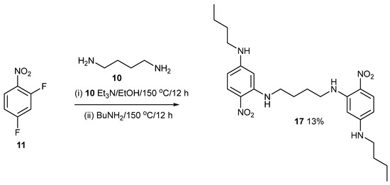 Figure 9 shows the synthesis of compound 17. The spacer has the most flexibility in these studies. Compound 17 is an isomer of compound 1, in which the positions of the bridging and terminal n-butyl chains on the nitrobenzene ring are swapped, so here, the two crystal structures can be compared (see below). For compound 1, butylamine reacted firstly in the ortho positions, followed by the linker in the para position. For compound 17, the linker reacts firstly in the ortho positions, followed by butylamine in the para positions. Compound 17 is poorly soluble and is unusually polar compared to its isomer 1. For this reason, only the IR and UV data have been reported, and the crystal structure and it could not be chromatographed with MeOH on silica gel. Compound 1 was purified by chromatography on silica gel with ether/dichloromethane mixture (20:80), which is significantly less polar. The alkylamino-nitro groups in compound 17 must bind to the silica surface or wrap round the silanol groups but they cannot in compound 1.