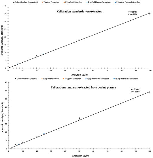 bovine plasma | 7.72 µg/mL 1 | 25.28 µg/mL 1 | 7.96 µg/mL 2 | 26.05 µg/mL 2 |