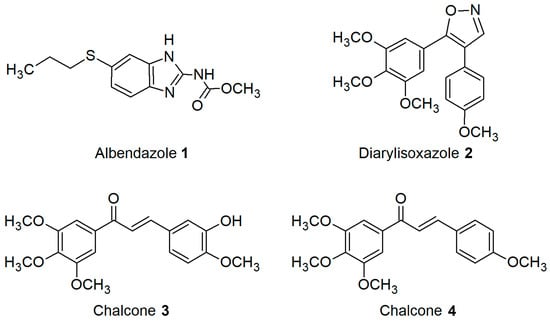 Stock solutions of albendazole 1 and isoxazole 2 were prepared in DMSO and 2-pyrrolidone at 10 mM concentration, and stock solutions of chalcones 3 and 4 were prepared in DMSO at 10 mM concentration. The stock solutions were further diluted with 96% EtOH, 5% Pluronic F127, 1.25% Pluronic P123, or FSW to obtain the final concentration range of a compound in embryo suspension relevant to the assessment of the antimitotic activity. The NOEC values of DMSO, 2-pyrrolidone, and EtOH in the in vivo assay were determined to be 0.2% v/v, 0.1% v/v, and 0.5% v/v, respectively. In all tests, the final concentration of the solvents in egg/embryo suspension did not exceed NOEC. The precipitation of compounds was analyzed via both visual and microscopic examination. The antimitotic activity of compounds 1–4 was assessed by exposing fertilized eggs to 2-fold decreasing concentrations of the compound within the concentration range applicable for clear assessment of the effect: 0.0005–0.01 μM for compounds 1 and 2, 0.005–0.2 μM for chalcone 3, and 0.05–1 μM for chalcone 4. Cleavage alteration and arrest were clearly detected at 2.5 h and 5.5 h after fertilization, when control embryos reached 8-cell and early blastula stages, respectively. The effects were estimated quantitatively as the minimum (threshold) effective concentration (MEC), resulting in cleavage alteration or full mitotic arrest. At these concentrations, all tested microtubule destabilizers caused 100% cleavage alteration/arrest and embryo death before hatching, whereas at 2-fold lower concentrations, the compounds failed to produce any effect. The embryos were observed with a Biolam light microscope (LOMO, St. Petersburg, Russia). Microphotographs were obtained using an AmScope binocular microscope with an MU500 digital camera (United Scopes LLC, Irvine, CA, USA). Sea urchin embryo assay data are available at http://www.zelinsky.ru. Experiments with the sea urchin embryos fulfill the requirements of biological ethics. The artificial spawning does not cause animal death, embryos develop outside the female organism, and both post-spawned adult sea urchins and the excess of intact embryos are returned to the sea, their natural habitat.