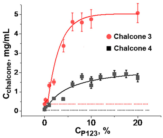As shown in Figure 2, the solubility of chalcones 3 and 4 increased by 13- and 19-fold, respectively, with the increasing of Pluronic P123 concentration up to 10%. Both curves reached a plateau that corresponded to the maximal amount of chalcone dissolved under given conditions. According to [36], a further increase in Pluronic P123 concentration under these conditions resulted in the formation of a gel phase, which, apparently, exerted a lower ability to dissolve lipophilic compounds.