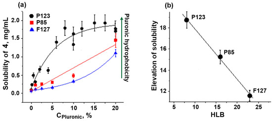 Solubility of chalcone 4 at different concentrations of Pluronics P85, P123, and F127 (a) and the correlation of solubility elevation with HLB values (b). Vertical bars: the mean squared error.