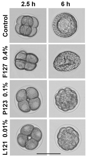 Representative morphological alterations of sea urchin embryos treated with Pluronics F127, P123, and L121. Fertilization envelope softening and embryo deformation caused by F127 at MEC = 0.4% w/v (316 μM). Developmental arrest and formation of aberrant blastulae with clearly visible fertilization envelope after exposure to P123 and L121 at MLC = 0.1% w/v (172.5 μM) and 0.01% w/v (22.7 μM), respectively. Fertilized eggs treatment. Incubation temperature: 23–24 °C. Average embryo diameter: 115 μm. Scale bar: 100 μm.