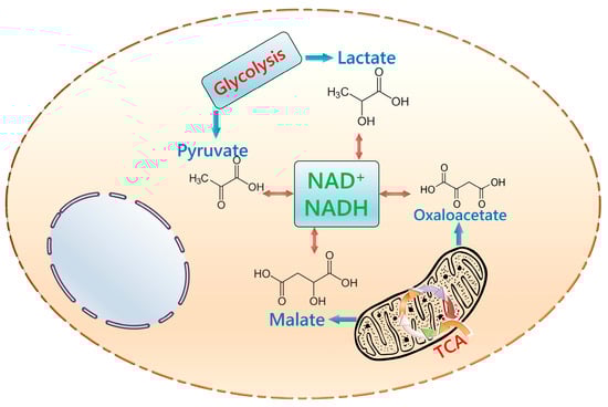 Lactate/pyruvate and oxaloacetate/malate as regulators of NAD+/NADH ratio in mammalian cells. TCA—tricarboxylic acid cycle.