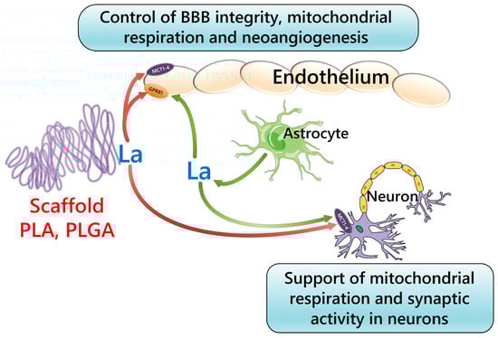 PLA and PGA have low toxicity and can be absorbed or hydrolyzed by growing cells. PLGA has a lower melting point. By increasing the glycolide content, the monomer concentration can control the degradation rate of this biopolymer. PGA, PLA, and PLGA support the growth of NVU cells by determining the interactions between the cells and the scaffold. PLA has a hydrophobic surface, which affects the amount of absorbed protein and cell adhesion. Through surface modification of the scaffold, neuronal cell behavior—differentiation, migration, and axon guidance—can be controlled [,,]. The hydrolysis of PLA produces L-lactic acid; thereby, the extracellular action of released lactate via GPR81 receptors or its cellular uptake via MCTs might significantly affect the ATP production and physiology of cultured cells (Figure 2).