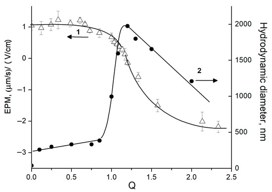 Anionic Alg (Mw 79 kDa) and cationic Pq10 (Mw 540 kDa) were each dissolved in pH 7 phosphate buffer and the solutions were mixed at varied molar ratios of anionic Alg groups to cationic Pq10 groups, Q = [Alg]/[Pq10]. The addition of Alg solution to a Pq10 solution altered the polycation charge; this was detected via measuring the electrophoretic mobility (EPM) of Pq10 macromolecules, the parameter associated with their charge (Figure 1, curve 1). These results evidenced an electrostatic Alg-to-Pq10 complexation and formation of Alg-Pq10 IPEC. As shown earlier [47,48], the electrostatic interaction of oppositely charged multi-ions is accompanied by the quantitative binding of both polymers into IPEC. It follows from here that the composition of the resulting IPEC is equal to the composition of the initial polyanion/polycation mixture [47,49]. Obviously, the same is true for the IPEC formation from Alg and Pq10, whereby each of which has a high molecular mass.