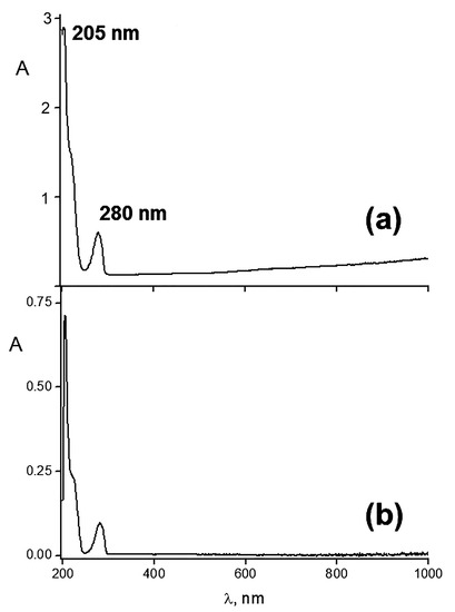 Figure 2a shows an electronic spectrum of HR ethanol solution with two characteristic peaks at 205 and 280 nm that is in agreement with the literature data [51]. The spectrum of the IPEC–HR composite (Figure 2b) showed the same profile with the two peaks at 205 and 280 nm, which evidenced the incorporation of HR into the IPEC matrix; a calculation gave a nearly equimolar HR/Alg ratio in the IPEC–HR composite (see legend to Figure 2b). However, the Q = 0.2 IPEC was able to incorporate an additional amount of HR, up to a 10-fold excess in comparison to the Alg content, which was at [HR]/[Alg] = 10 molar ratio.