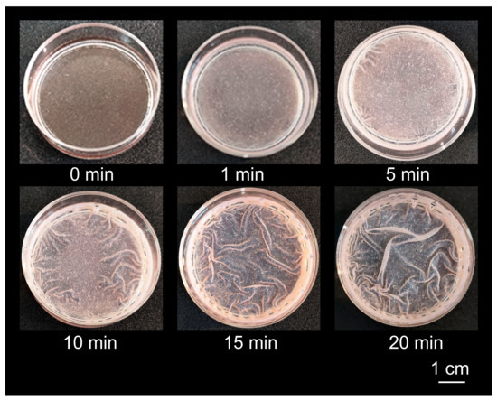Swelling in water of the coating from IPEC–HR composite pre-formed on a polystyrene Petri dish, as described in the legend to Figure 3b. The scale bar applies to each subfigure.