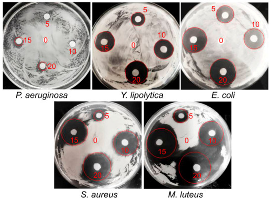Inhibition zones (red circles) of the IPEC–HR composite against the tested microorganisms; 10–2 M pH 7 phosphate buffer/ethanol mixture (98/2 v/v), Q = 0.2; [Pq10] = 2 × 10–2 M; [HR] = 5 × 10–2 M. The red numbers on the photos indicate a volume (µL) of IPEC–HR composite applied to the disc. Control sample (20 µL of IPEC without HR) was applied to the central disk and marked as “0”.