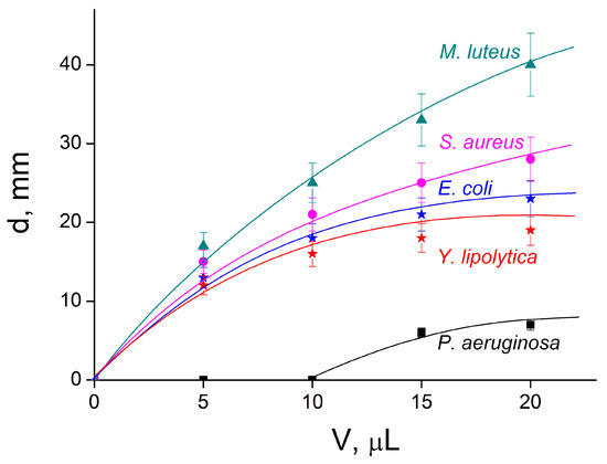 Dark rings around the paper disks reflect microbial growth suppression due to the diffusion of HR from the disks to agar with the microbial culture via a “relay-race” mechanism through repeated formation and the destruction of hydrogen bonds between HR and the agar matrix [56]. The wider the ring, the more active the formulation applied. The dependence of the ring diameter on the volume of applied formulation is given in Figure 6.