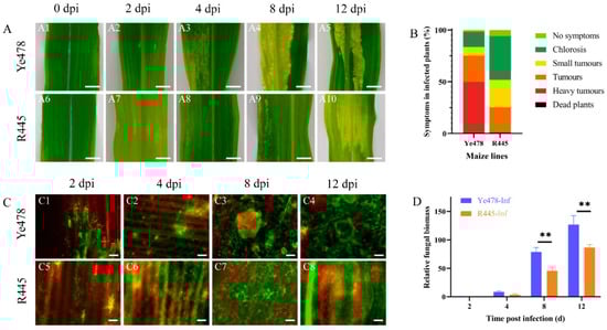 Phenotypic changes in maize after U. maydis infection. (A): Phenotypic changes in maize after U. maydis infection. (A1–A5 and A6–A10) Phenotype of Ye478 and R445, respectively, at 0, 2, 4, 8, and 12 days postinfection (dpi) with U. maydis SG200 strain; scale bar = 1 cm. (B): symptoms in Ye478 and R445 infected with U. maydis. (C): Hyphal development of U. maydis SG200 in maize leaves as detected with WGA AF488/propidium iodide co-staining. (C1–C4 and C5–C8) The hyphal growth dynamics in Ye478 and R445, respectively. The samples were collected at 2, 4, 8, and 12 dpi; scale bar = 100 μm. (D): Quantification of fungal biomass according to the amount of genomic DNA using fungus-specific (ppi) primers. qPCR was performed at 2, 4, 8, and 12 dpi using plant-specific (GAPDH) and fungus-specific (ppi) primers. Data were analyzed using Student’s t test. ** represents significant difference at p ≤ 0.01.