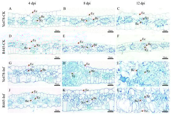 The changes in cell morphology induced by U. maydis were observed using paraffin sectioning at 4 to 12 dpi. The size of the upper and lower epidermis was generally bigger in Ye478-CK than in R445-CK (Figure 2). At 4 dpi, no significant change in the leaf cells was observed in both lines; both upper and lower epidermis cells were distributed evenly, and bundle sheath cells were normal in number. A blue-green lignified layer was observed in the epidermis of R445-Inf but not in that of Ye478-Inf (Figure 2G,J). At 8 dpi, in Ye478-Inf, the epidermis cell wall was thickened; the number of bundle sheath cells was increased; cell swelling was observed; and surface area expanded after U. maydis infection. However, the bundle sheath cells were intensively divided in R445-Inf (Figure 2H,K). At 12 dpi, in Ye478-Inf, bundle sheath cells continuously divided and the mesophyll cell number was approximately doubled; bundle sheath cells continuously expanded, and their structural features were blurred during tumor maturation. However, the stress responses in R445-Inf were less severe than those in Ye478-Inf (Figure 2I,L).
