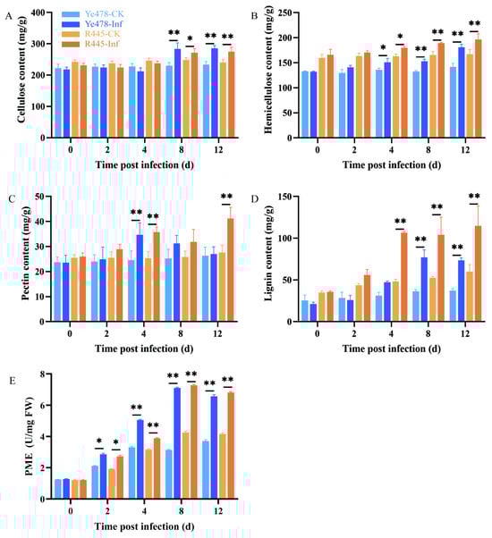 The changes of cell wall components in the leaves infected by U. maydis. (A) cellulose, (B) hemicellulose, (C) pectin, (D) lignin, and (E) pectin methylesterase (PME) activity in protein extracts from uninfected and infected leaves infected by U. maydis. Samples of Ye478 and R445 were collected at 0, 2, 4, 8, and 12 dpi. Ye478-CK/R445-CK: leaves infected with ddH2O; Ye478-Inf/R445-inf: leaves infected with U. maydis. Student’s t test, * and ** represent significant difference at p ≤ 0.05 and ≤0.01, respectively.