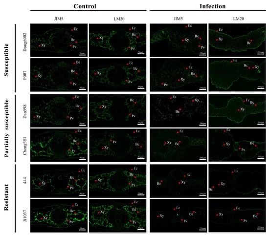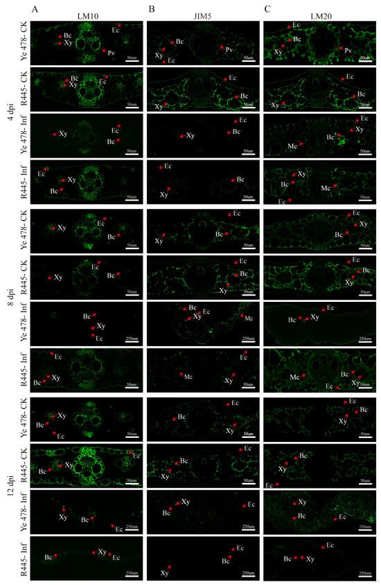 At 4 dpi, immunolabeling with LM20 antibodies indicated that the signals were relatively stronger in Ye478-Inf and R445-Inf, particularly in the bundle sheath cells, epidermis, and mesophyll cells. The signals were stronger in Ye478-CK than in R445-CK. However, at 8 dpi, a slightly weaker signal was observed in the bundle sheath cells, epidermis, and mesophyll cells in Ye478-CK than in R445-CK, respectively. At 12 dpi, a significantly weaker signal was observed in the bundle sheath cells, epidermis, and mesophyll cells in Ye478-Inf than in Ye478-CK. Consequently, the signal decreased significantly more in R445-Inf than in R445-CK, and a labeled cell wall profile was observed, which was consistent with the results of PME activity (Figure 4C).