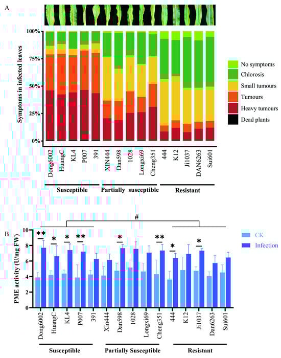 Development of U. maydis infection and PME activity in the 15 maize inbred lines with different resistant levels. (A) Disease symptom classification of 15 maize inbred lines with different resistant levels (susceptible, partially susceptible, and resistant) infected with U. maydis SG200. (B) Pectin methylesterase activity was quantified at 8 dpi. CK: inoculated ddH2O as control; Infection: leaves infected by U. maydis; Student’s t test, * and ** represent significant difference at p ≤ 0.05 and ≤0.01, respectively. LSD (least significant difference) test, # represent inter-group difference at p ≤ 0.05.