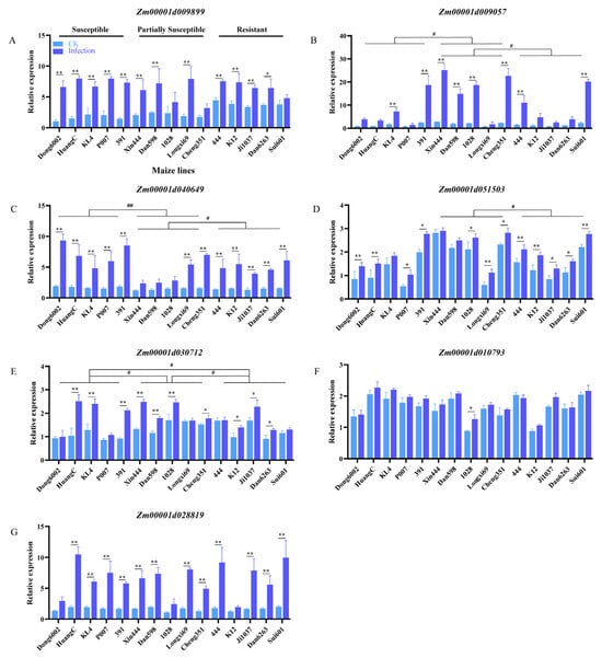 Expression of PME-synthesis-related genes during disease progression in 15 maize inbred lines with different resistant levels. Relative expression of seven PME-synthesis-related genes was assessed at 8 dpi using qRT-PCR. (A–G) PME-synthesis-related genes in maize. CK: inoculated ddH2O as control; Infection: leaves infected with U. maydis SG200; Student’s t test, * and ** represent significant difference at p ≤ 0.05 and ≤0.01, respectively. LSD (least significant difference) test, # and ## represent inter-group difference at p ≤ 0.05 and ≤0.01.