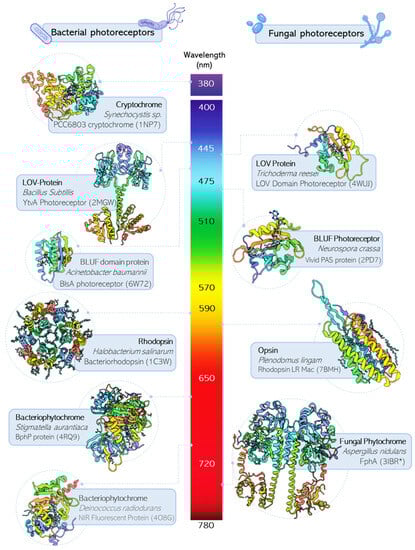 Bacterial and fungal photoreceptors. Many of the photoreceptors of fungal and bacterial origin have been abundantly analyzed, and their crystallographic structures have been elucidated, which has allowed for a more exact understanding of their photoreceptive mechanisms. In the figure, you can see the structures of some types of photoreceptors, which are connected to the visible spectrum at the wavelength corresponding to their absorption capacity. The PDB code corresponding to each structure has been placed between parentheses. In the case of photoreceptors from fungi, it was observed that there is a lower abundance of elucidated crystallographic structures. * Such is the case for the red light-sensing photoreceptor FphA from Aspergillus nidulans, which is known, by sequence alignment, to only differ by 5 aminoacidic residues from the Pseudomonas aeruginosa photoreceptor. Partially created with BioRender.com.