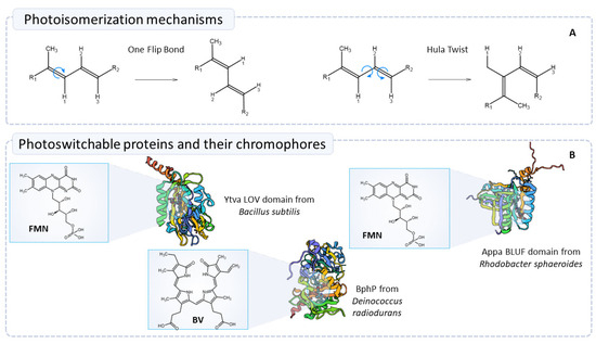 Photoisomerization mechanisms and cofactors of photoswitchable proteins. (A) The main mechanisms of photoisomerization. OFB mechanism produces a trans-S-trans conformation, meanwhile HT produces a trans-S-cis conformation. (B). Examples of the main photoswitching protein families found in fungi and bacteria; left, an example of LOV domain protein (PDB: 2PR5) with a flavin chromophore; center, an example of BhpP (PDB: 4O8G) with a biliverdin chromophore; right, an example of BLUF domain protein (PDB: 1YRX) with the flavin chromophore. Partially created with BioRender.com.
