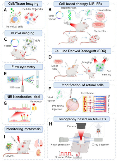 In vivo and in vitro NIR-based imaging applications with NIR-FPs. (A) Visualization of individual cells and cell network interactions. (B) Monitoring of modified stem cells that express NIR-PFs by a viral vector strategy. (C) Packaging of NIR-PFs into VLPs for in vivo imaging. (D) Stability and function in mouse xenograft models. (E) Separation of cell populations by flow cytometry. (F) Study of cell physiology without interference from retinal neural photoreceptors. (G) NIR fluorescent nanobodies for visualization of specific biomarkers. (H) Use of NIR-FPs to perform a tomography. (I) Cancer cells labeled with NIR-FPs make it possible to track metastasis in vivo. Partially created with BioRender.com.