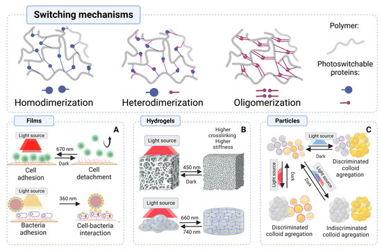 Optoprotein-based materials (OPMs) refer to a class of materials functionalized with photoswitchable proteins [134]. This modification allows the manipulation of material properties, including mechanical behavior [135], thermal conductivity [136], cell adhesion [137], optical response [138], conductivity [139], and morphology [140]. In the scientific literature [141,142], there are references to “smart” materials that show sensitivity to changes in light; however, it must be considered that most of these resulting alterations are usually irreversible. Unlike other materials with photosensitivity, OPMs possess a distinctive feature: their reactions can be reversed when exposed to darkness or a specific wavelength [134]. Furthermore, they also show specific interactions with different wavelengths of light. In practice, glass meshes [137,139], hydrogels [143,144], and aggregated colloidal particles represent typical materials effectively functionalized using optoproteins [145]. The mechanisms of light-induced assembly, including homodimerization, heterodimerization, and oligomerization, are depicted in Figure 4. These processes play a crucial role in altering the degree and quantity of crosslinking and adhesion when photoswitchable proteins are incorporated within materials [134].