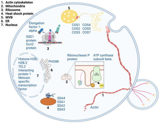 Three protein lysate samples obtained by a standard bead beating method as stated in Section 4.2 were dialyzed against a binding buffer without glycerol (50 mM Tris HCl, pH 7.4, 10 mM NaCl, and 5 mM MgCl2) overnight at 4 °C. Each protein lysate sample was transferred to one of the following solutions: (1) QD-conjugated to COOH-coated magnetic beads; (2) COOH-coated magnetic beads (SKU #MGB-COOH-10-10); or (3) NH2-coated magnetic beads (SKU #MGB-NH2-10-10). The mixture was allowed to bind in the binding buffer (Invitrogen, Vilnius, Lithuania) at 4 °C overnight. Unbound proteins were washed away using cold 1× PBS. The 1× SDS loading buffer (2% SDS, 100 mM Tris-HCl, pH 6.8) was added for 2 h to cause protein dissociation from the QD–magnetic bead complex. Dissociated proteins were then dialyzed in 1× PBS overnight at 4 °C. Samples were centrifuged and a supernatant containing proteins was obtained. Protein samples were lyophilized for 2 days to remove excess liquid. An amount of 100 µL of 1× PBS was added to the protein sample, and protein concentration was measured by using a BSA standard curve. A total of 50 µL of protein was shipped in dry ice to Creative Proteomic (Shirley, NY, USA) for shotgun proteomics. After arrival, samples were loaded into an SDS-PAGE gel (12% separating gels) and run at 80 kV for 30 min, then 120 kV for an hour to fully separate protein bands. Protein bands were stained and cut into 1 mm3 cubes and transferred into a microcentrifuge tube. Next, proteins were removed from the gel slice by trypsin digestion. The supernatant containing the resulting peptides was lyophilized into powder. The peptide samples were resuspended in 20 μL of 0.1% formic acid before an LC-MS/MS analysis. The samples were assessed by an UltiMate 3000 nano UHPLC system and a Q Exactive HF mass spectrometer (Thermo Fisher Scientific, Waltham, MA, USA). Raw MS data files were analyzed against the Saccharomyces cerevisiae protein database in the MaxQuant program (1.6.2.6). The experiment was conducted in a triplicated manner. Diagrams of identified proteins and impacted processes were created with BioRender.com.