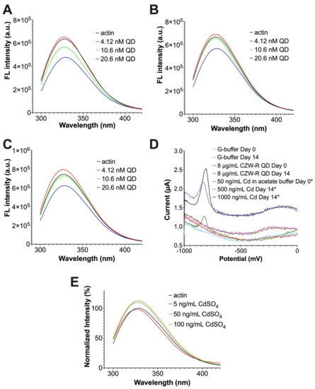 Currently, the literature on CdSe/ZnS QDs has suggested that the negative impact of these QDs in cells may result from the leakage of cadmium ions [66,67]. Therefore, it was important to investigate if the fluorescence quenching that we observed was influenced by leaked cadmium (Cd2+) ions. To achieve this, we first examined the amount of Cd2+ ions leaked from QDs over the course of 14 days. According to our results, the amount of leaked Cd2+ ions from QDs after 14 days was below the detectible limit of 50 ppb or 50 ng/mL (Figure 3D). Based on this result, we performed a fluorescence quenching assay where we treated 5–100 ng/mL of Cd2+ ions in the form of CdSO4 and measured the intrinsic fluorescence of G-actin. Our data revealed that at 5–100 ng/mL of Cd2+ ions, the intrinsic fluorescence of G-actin did not quench the intrinsic fluorescence of G-actin (Figure 3E). Therefore, we concluded that the previously observed fluorescence quenching of G-actin by CdSe/ZnS QDs was not influenced by leaked cadmium ions.