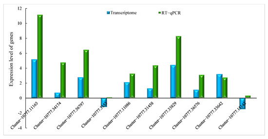 Comparison of the expression levels of genes in RNA-Seq and qRT–PCR analyses. Blue, expression level as determined by RNA–Seq; green, expression level as determined by qRT–PCR.