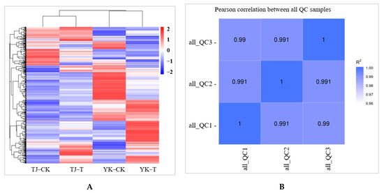 A chart of data quality control. (A) Heatmap of DAMs confirmed the significant differences in the metabolomes of TJ and YK; (B) The R2 value between the QC samples. QC, quality control.