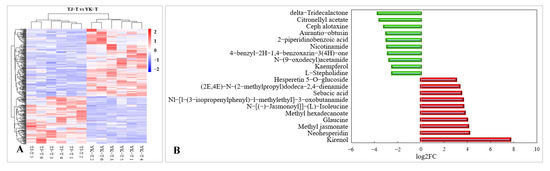 A widely targeted metabolome analysis was performed on samples taken from susceptible (TJ) and resistant (YK) leaf samples following C. zanthoxyli infection at 12 dpi (Figure 6). A total of 467 metabolites were obtained in all the samples, as presented in the heatmap, which shows a distinct hierarchical clustering of the samples by variety (Figure 4A). A heatmap of the DAMs confirmed the significant differences in the metabolomes of the TJ and YK leaf samples following C. zanthoxyli infection (Figure 6A). Based on the quantitative analyses of all the detected metabolites and the fold change (FC) threshold, a total of 182 DAMs were obtained in the comparison of TJ-T vs. YK-T, of which 112 metabolites were downregulated and 70 metabolites were upregulated in TJ-T. The R2 value between the quality control (QC) samples was close to 1 (Figure 6B), indicating that the whole testing process is reliable and that the quality of the data is excellent.