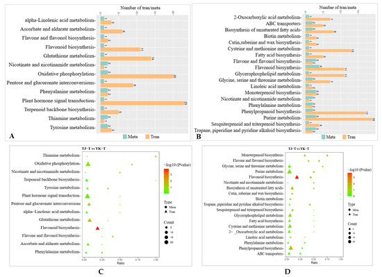The GO annotation analysis and KEGG enrichment analysis of DAMs in different comparisons. (A) GO annotation analysis. (B) Significantly enriched KEGG pathways in the TJ-CK vs. TJ-T comparison. (C) Significantly enriched KEGG pathways in the YK-CK vs. YK-T comparison. (D) Significantly enriched KEGG pathways in the TJ-CK vs. YK-CK comparison. (E) Significantly enriched KEGG pathways in the TJ-T vs. YK-T comparison. Round dot indicate genes and triangle indicate metabolites.