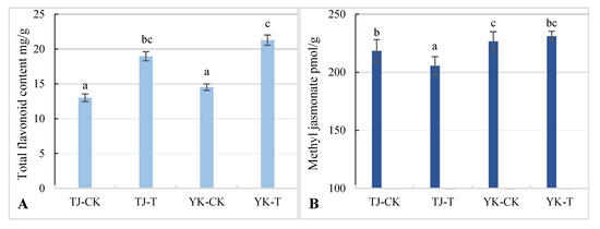 The contents of the total flavonoids and MeJA in Z. armatum leaves under different treatments were further calculated. The sample groups were the same as those of the transcriptome analysis, namely, TJ-CK, TJ-T, YK-CK, and YK-T. The extraction of the total flavonoids was performed according to the previously reported method with slight modifications [65,66]. The MeJA content was determined using the enzyme-linked immunosorbent assay method [67].