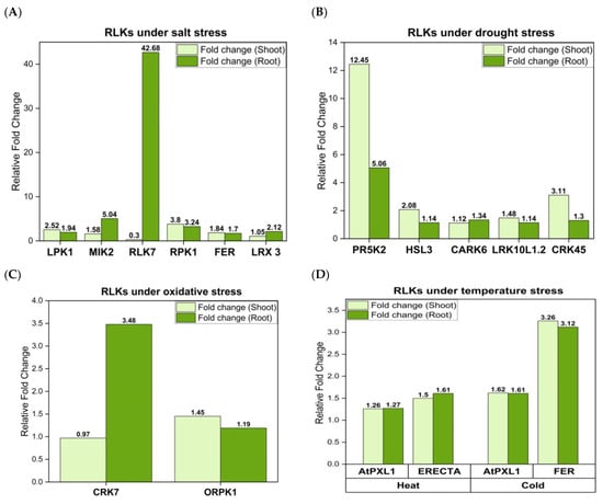 Much research has been conducted that provides fundamental insights into mechanisms by which different RLKs activate defenses against microbes [,,,]. However, only a handful of studies have shed light on the role of RLKs in abiotic stress responses and the potential mechanisms underlying RLK-mediated abiotic stress tolerance [,]. A deeper understanding of kinase signaling cascades in responses to fluctuating environmental conditions such as drought, heat, cold, or salt is paramount to engineer stress-tolerant crops []. This review provides insights into the classification of RLKs and the biological functions of RLKs and RLCKs in coordinating the responses of different plant species against abiotic stresses such as salinity, drought and oxidative stress. Furthermore, this review also highlights arising avenues of future research to unravel novel targets of plant stress responses.