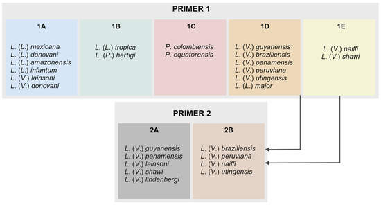 Schematic representation of the species groups coupled in each variant obtained by PCR reactions with primers 1 and 2; suggestion of the algorithm to differentiate the main species circulating in the Americas.