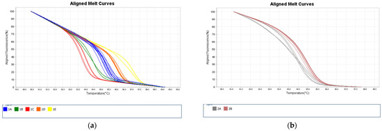 Color-coded dissociation curves of reference strains selected as standards for primers 1 (a) and 2 (b). (a) The identified variants for primer 1: blue—variant 1A; green—variant 1B; red—variant 1C; orange—variant 1D; yellow—variant 1E. (b) The identified variants for Primer 2: curves in gray—variant 2A; curves in brown—variant 2B. Figures were exported from the High-Resolution Melting Software (version 3.0) available at the ViiA 7 Real-Time PCR System (Thermo Fisher Scientific, Waltham, MA, USA).