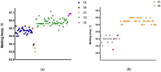 Color-coded Melting Temperatures (Tms) according to Primers 1 (a) and 2 (b) variants. TMs obtained during the validation assay (a): blue circle = 1A; brown square = 1B; orange inverted triangle = 1C; green = 1D; pink diamond = 1E. (b) Grey circle = 2A, orange diamond = 2B. The three divergent results are represented in red: (a) red circle: IOCL 3310, L. naiffi clustered as 1A (expected to be 1E); (b) red circles correspond to the two L. braziliensis and the one L. naiffi inaccurately clustered as variant 2A (expected 2B).