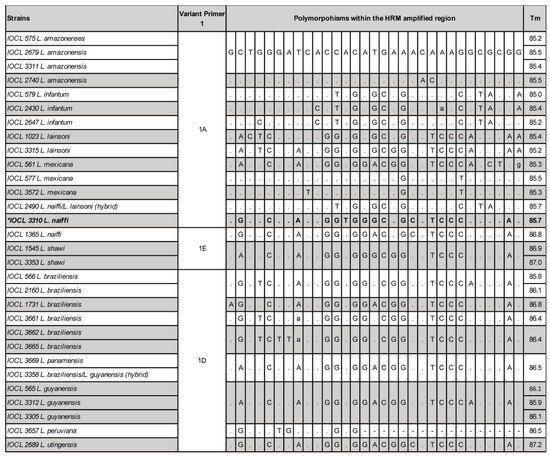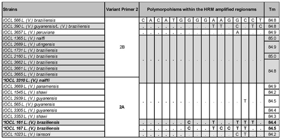 Noteworthy, different combinations of various polymorphisms are observed among samples typed as the same variant, sharing similar Tm values, and melting curve profiles (e.g., Variant 1A). Conversely, the occurrence of very few polymorphisms was observed between samples with distinct Tms, melting curve profiles, and divergent typing results, as observed for the divergent IOCL 3310 (L. naiffi) strain for Primers 1 and 2 (Figure 4 and Figure 5). For this sample, only two SNPs (T/A and G/A) in the Primer 1 region led to Tm 85.7 °C, representing a 1.1 °C variation from the reference strain L. naiffi (IOCL 1365; Tm 86.8 °C). Distinct melting curve profiles were also observed for this sample (Figure 6). Primer 2 also revealed a divergent typing result for IOCL 3310 (L. naiffi) (Figure 5), despite the absence of polymorphism within the amplified region. The other two samples, both L. braziliensis strains, diverged in typing outcome; however, only for the second set of primers (Figure 5 and Supplemental Table S2). The polymorphisms observed in these samples (Figure 5) are the most likely cause for both the Tms and the melting curve profiles to diverge from the reference (Figure 6). These observations suggest that HRM divergent results cannot be directly and exclusively associated with polymorphisms and/or Tms, which, although combined, could potentially affect typing accuracy. Other undetectable factors may possibly be involved and would need further analysis.