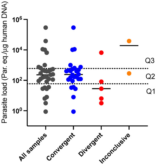 Considering the potential effect parasite load has on molecular typing outcomes, we plotted the distribution of normalized parasite load in the samples according to the HRM-based species typing outcomes (Inconclusive, Divergent, and Converging). The result is represented in Figure 7. Most of the samples presenting inconclusive results by HRM (3/5) were likewise not quantifiable due to the low parasite load and therefore not represented in Figure 7. For the two remaining inconclusive samples, of which parasite load determination was possible, the median value of parasite equivalent per μg of human DNA was considerably higher (1.9 × 104 par. Eq./μg human DNA) than for the Divergent and Convergent groups, respectively (2.8 × 101 par. Eq./μg human DNA and 2.4 × 102 par. Eq./μg human DNA). Such an association between typing success and Leishmania burden was also observed when Divergent and Convergent groups of samples were compared (Figure 7). We determine the quartiles and interquartile ranges to search for the parasite load interval that would provide better accuracy for HRM typing outcomes. The interquartile range (25–75%) of parasite load for all assayed samples was determined as 5.9 × 101–6.0 × 102 (par. Eq./μg human DNA) (Figure 7, doted lines). The Convergent group interquartile range was narrowed within 1.1 × 102–5.7 × 102(par. Eq./μg human DNA), while for the Divergent group. The range was widely dispersed outside this range (4.7 × 101–3.3 × 103 par. Eq./μg human DNA). Within the interquartile range (Figure 7, Quartile 2), 15/17 samples (88.2%) revealed an HRM convergent typing result, while for the first (Q1) and third (Q3) quartiles, the accuracy was reduced to 5/8 (62.5%) and 6/8 (75%), respectively. The data reveal the parasite load interval with the best accuracy for the HRM typing scheme.